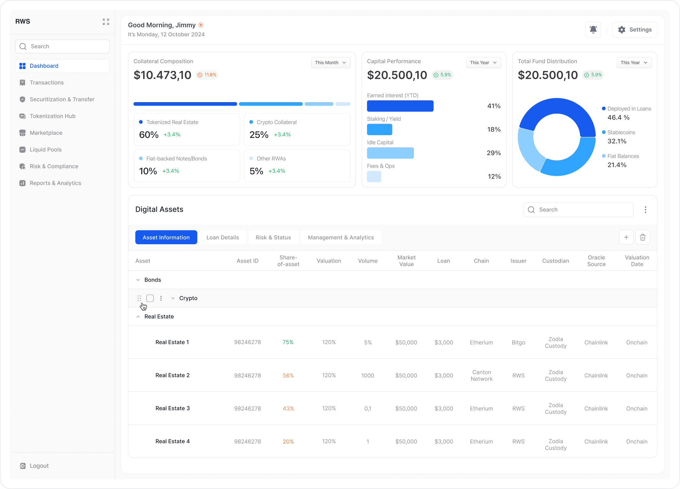 Package loans into tradable securities with standardized documentation, automated servicing and on-chain tracking. The same capital markets infrastructure used for traditional mortgages - now for digital assets.